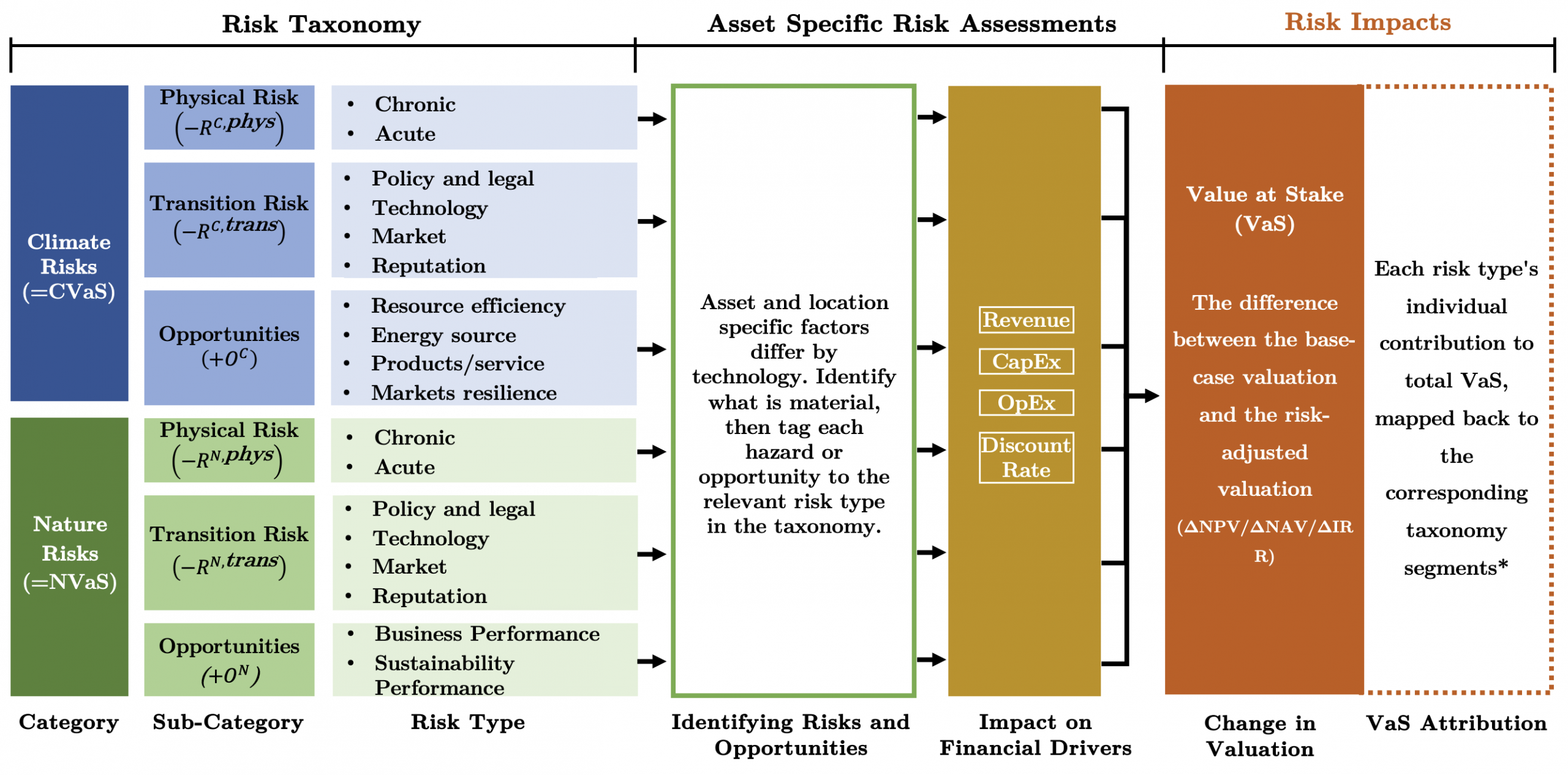 Asset level Climate Value at Stake (CVaS) and Nature Value at Stake (NVaS) treat climate and nature as explicit value adjustments to an existing base case valuation, expressed in changes in NPV, NAV, or IRR terms. In practice, assessments begin at the asset level. Risk signals relevant to each asset’s technology and location are translated into expected financial effects through existing budget items: revenue, OpEx, CapEx, and the Discount Rate. Each asset is assumed to have a baseline valuation without climate or nature considerations, with CVaS and NVaS representing the monetised change to that baseline driven by risks and opportunities. CVaS reflects the combined effect of physical and transition climate risks alongside climate related opportunities, while NVaS reflects the effect of physical and transition nature risks that reduce value and nature related opportunities that increase value. In both cases, value impacts are decomposed into three blocks: physical risks, transition risks, and opportunities. Physical risks are divided into acute and chronic components, while transition risks are structured across policy and legal, technology, market, and reputation channels. Climate opportunities follow established categories such as resource efficiency, energy sources, products and services, and market resilience, while nature opportunities are structured around business performance and sustainability performance.