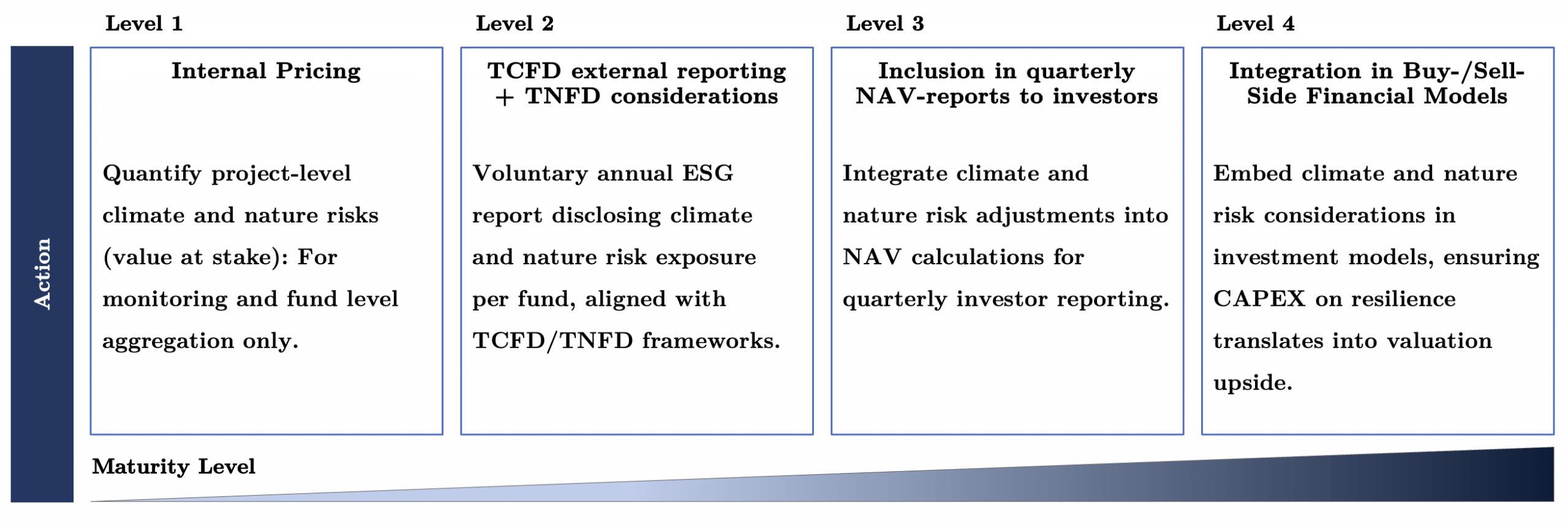 Level 4: Full Financial Integration. The final stage is full integration from the outset. Climate and nature risks are embedded directly into base case assumptions during due diligence and underwriting: physical risks inform generation profiles, asset lifetimes, operating costs, and resilience CapEx, while transition risks shape regulatory assumptions, market outlooks, and discount rates. Opportunities are incorporated where credible and evidence supported. At this level, CVaS and NVaS are no longer separate analytical overlays. They are woven into acquisition pricing, portfolio construction, and exit strategies, and treated with the same rigor as market, credit, and liquidity risk.
