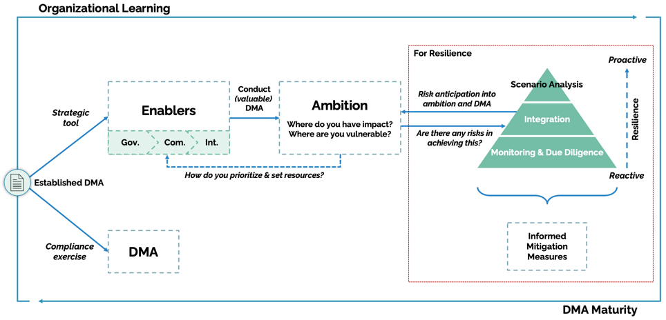 Embedding DMA into core corporate processes further enhances organizational resilience. Instead of being confined to sustainability teams or annual reports, DMA becomes integrated into broader corporate strategy, risk management, governance, and stakeholder engagement. This holistic integration ensures organization-wide alignment in monitoring and responding to ESG issues, enabling proactive identification and mitigation of risks.