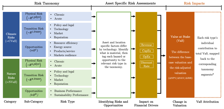 The proposition is conceptually elegant: climate and nature exposures are treated as value adjustments to an existing baseline, expressed as “Value at Stake” (VaS). The framework assumes that each asset carries a base case valuation metric (NPV/NAV/IRR) without explicit climate or nature adjustments, and that both risks and opportunities can be monetized as changes to that baseline. Risks reduce present value; opportunities add to it. Once VaS is expressed at the asset level, figures aggregate upward to the fund and manager level using economic exposure weights such as NAV or invested capital shares. Drawing inspiration from statistical VaR percentiles used in market risk, VaS is best understood as the expected effect of applied assumptions across specific climate and nature scenarios.