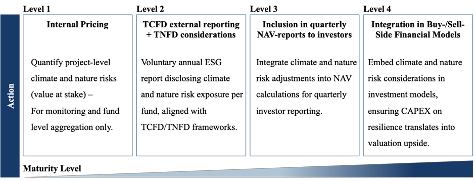 Level 1: Internal Pricing. At the first stage, managers quantify Climate Value at Stake (CVaS) and Nature Value at Stake (NVaS) at the asset level using the taxonomy. These adjustments remain internal and are not yet incorporated into reporting or investor communication. Even at this stage, they serve as a powerful internal risk valuation tool, establishing baseline exposure and supporting due diligence, monitoring, and mitigation strategies such as insurance.