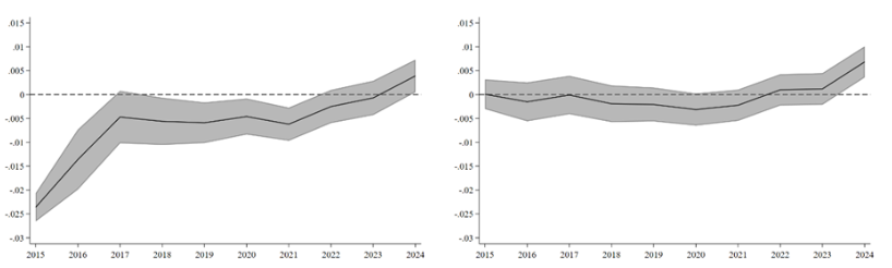 Results from the cross-sectional ordinary least squares model reveal a clear trend. From 2015 through 2017 the coefficient on the green label is negative and statistically different from zero, confirming that green bonds were indeed issued at lower yields. Yet the absolute size of the discount narrows every year, falling from roughly six basis points in 2015 to a statistically negligible level by 2020. By 2024 the coefficient has turned positive, indicating that issuers of green bonds now pay a slightly more. Confidence intervals widen in the later years, suggesting growing dispersion in investor valuations as the market matures and supply becomes abundant.